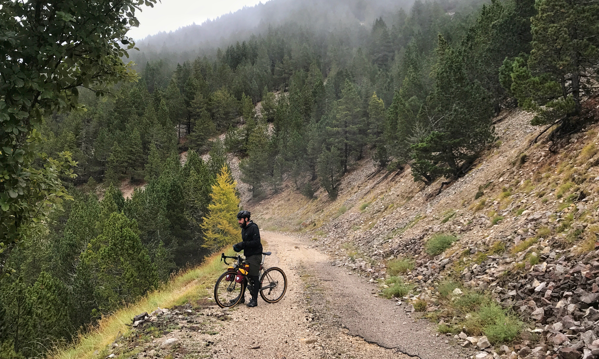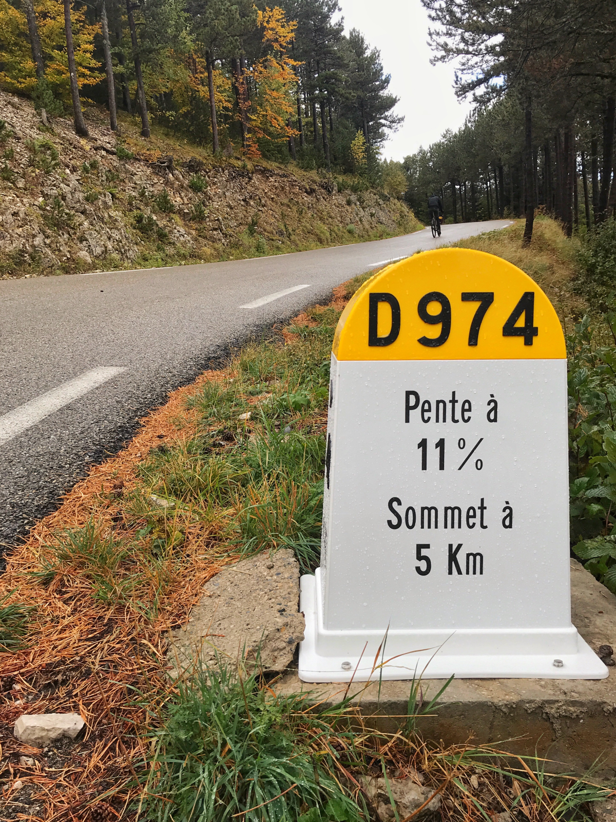 L’ascension commence après environ trois kilomètres de route, virage à droite et boom. On est accueilli par un gravier bien attendri par la pluie mais surtout du dénivelé positif… genre beaucoup ! Cette face du Ventoux se grimpe à la régulière. Les moins patients en paieront le prix dans quelques kilomètres quand les pourcentages vont avoisiner les 15%… De temps en temps nous apercevons le sommet entre la brume et les montagnes. C’est pas idiot à regarder mais on commence à sentir que la vue panoramique qui doit nous attendre au sommet ne sera peut être pas au rendez-vous. Bien vu l’aveugle, on voit à peine à 30 mètres !