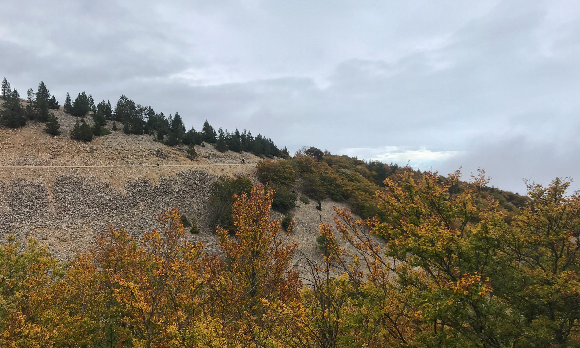 Ce sentier est parfait et nous permet de longer les flancs du Ventoux dans un décor lunaire. On distingue le sommet souvent entre 2 virages. C’est finalement agréable de le voir avec un peu de recul aussi.