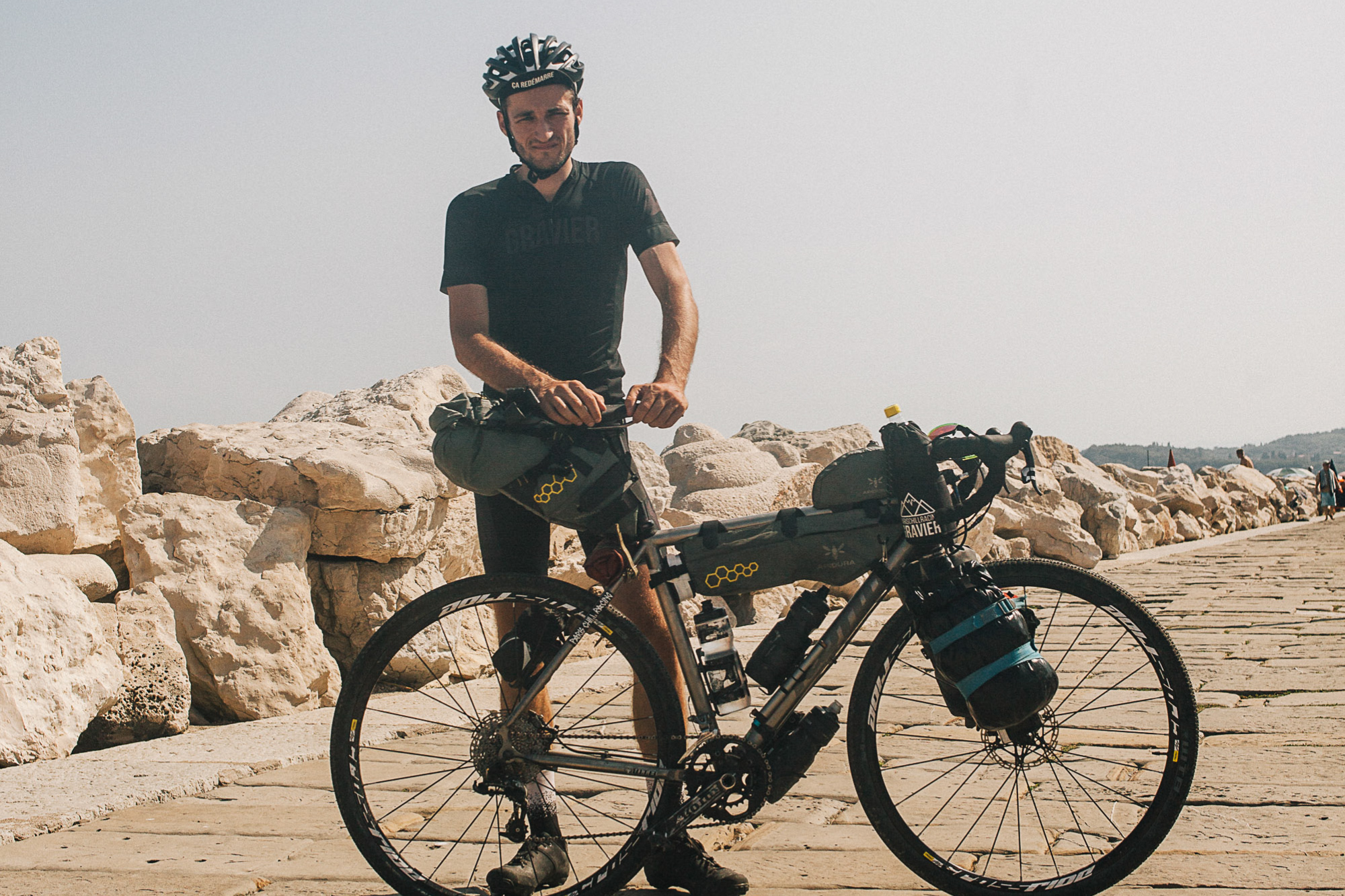 Pour le reste, c’est vous qui voyez (si possible en titane, mais c’est juste notre avis), on est ouvert à tout. On met juste un véto sur les cadres de VTT avec des cintres route et aux gravels avec prolongateurs. Au final, on n’a pas deux vélos identiques dans le groupe. C’est un peu la foire à la saucisse (en titane) entre les groupes, les largeurs de pneus, les sacoches…