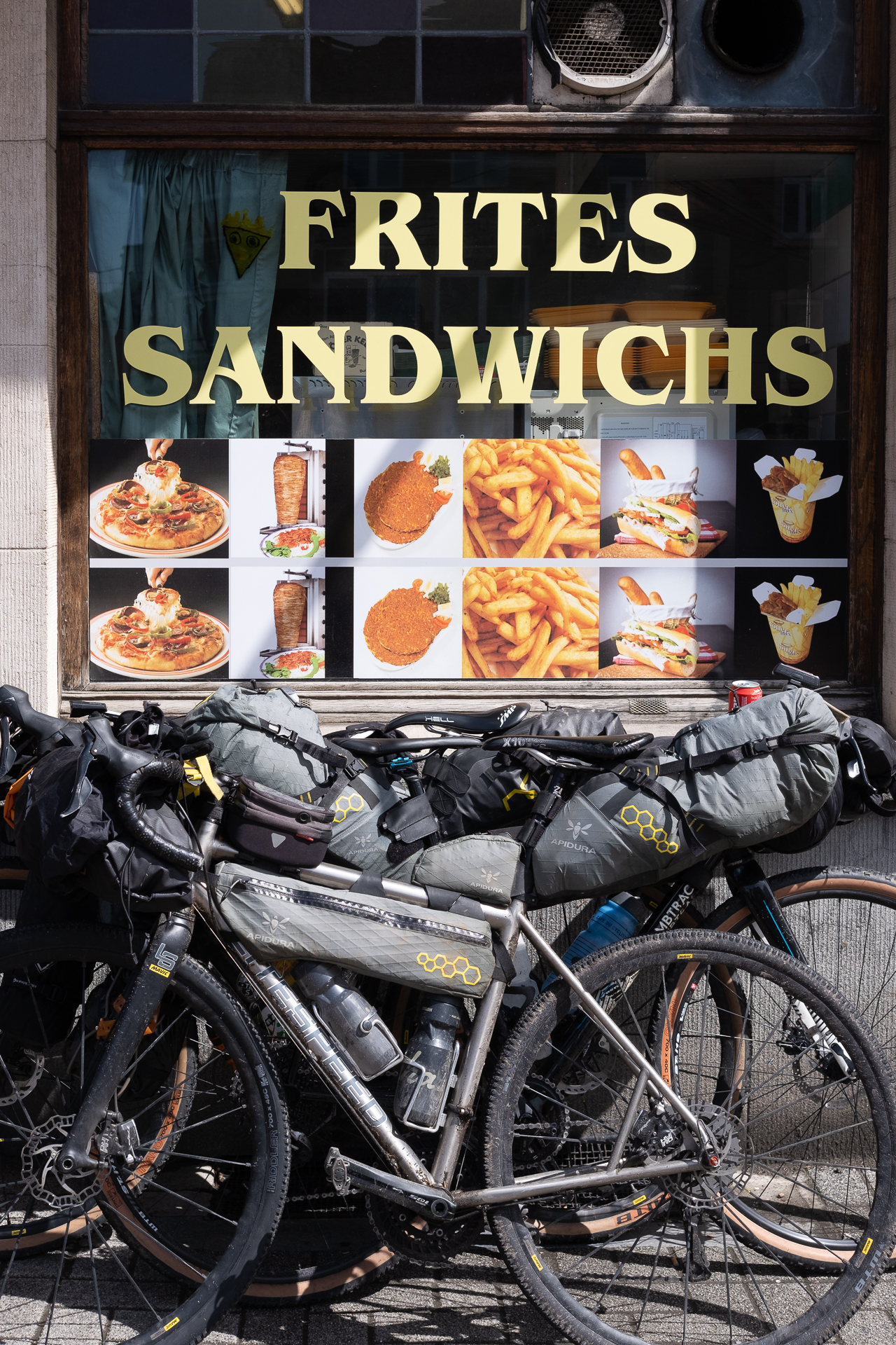 Nous constatons une fois de plus de la qualité des traces proposées par le site bikepacking.com. C’est propre, sans bavure, sans obstacle infranchissable et nous régale de paysages et autres réjouissances gustatives. Un pur bonheur. Arrivée au camping, petit stop au restaurant. Le moins que l’on puisse dire c’est que les Belges n’aiment pas dîner tard. Alors pour être sûrs d’avoir quelque chose à se mettre sous la dent ce soir, nous décidons de manger tout de suite et de planter nos tentes plus tard. Je gratte quelques œufs en cuisine pour le petit déjeuner de demain matin.
