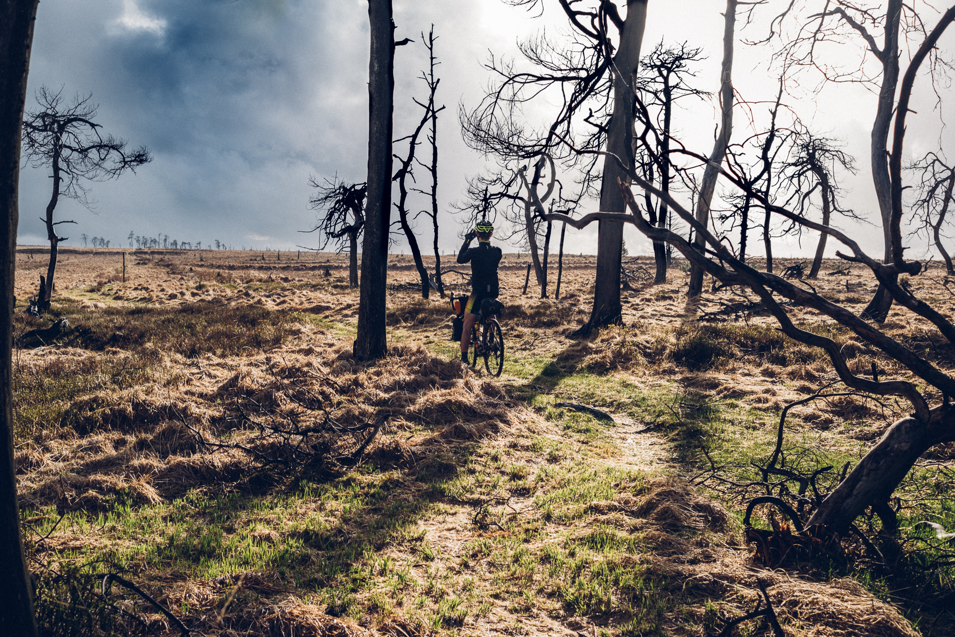 C’est un plateau, pas trop loin du point culminant de la Belgique. Le paysage y est très spécifique. Presque aucun arbre, certains morts ou calcinés. Une tourbière très humide avec des herbes hautes kaki. Nous attaquons le parc par une longue ligne droite qui nous permet de le traverser entièrement avant de remonter à rebrousse-poil dans la tourbière.