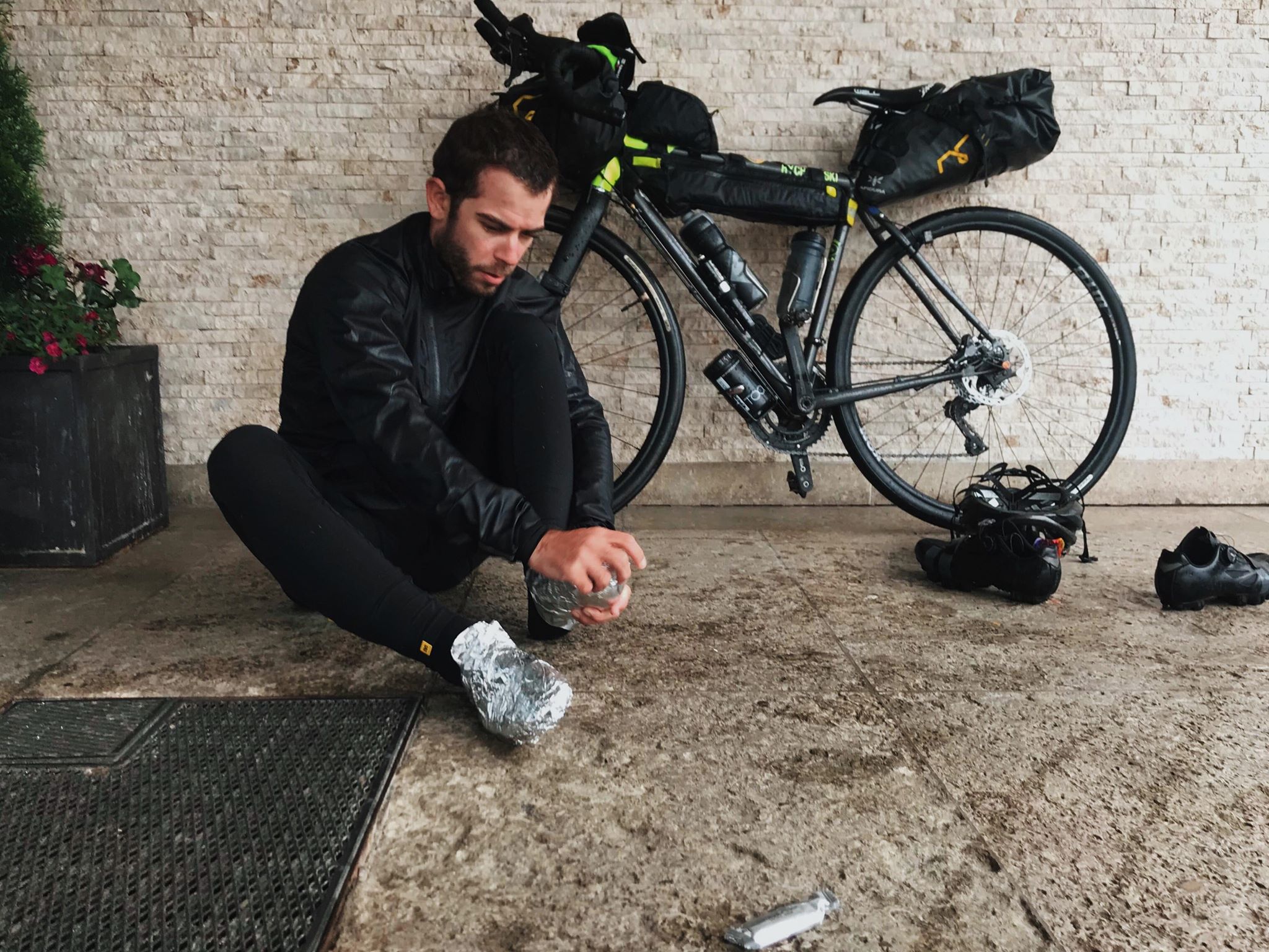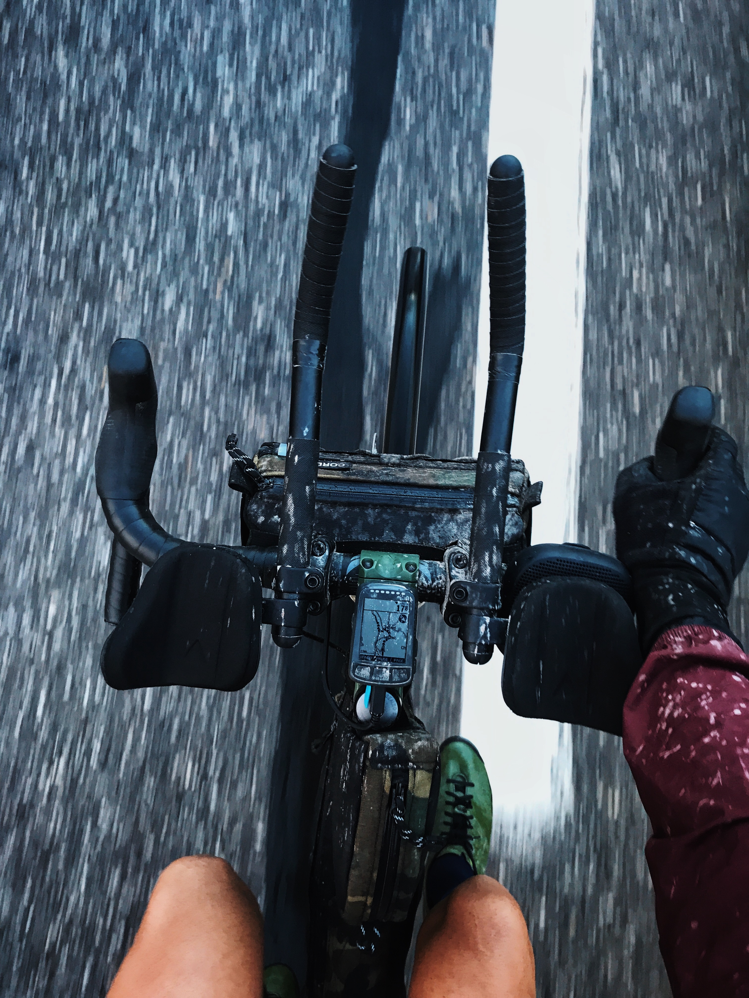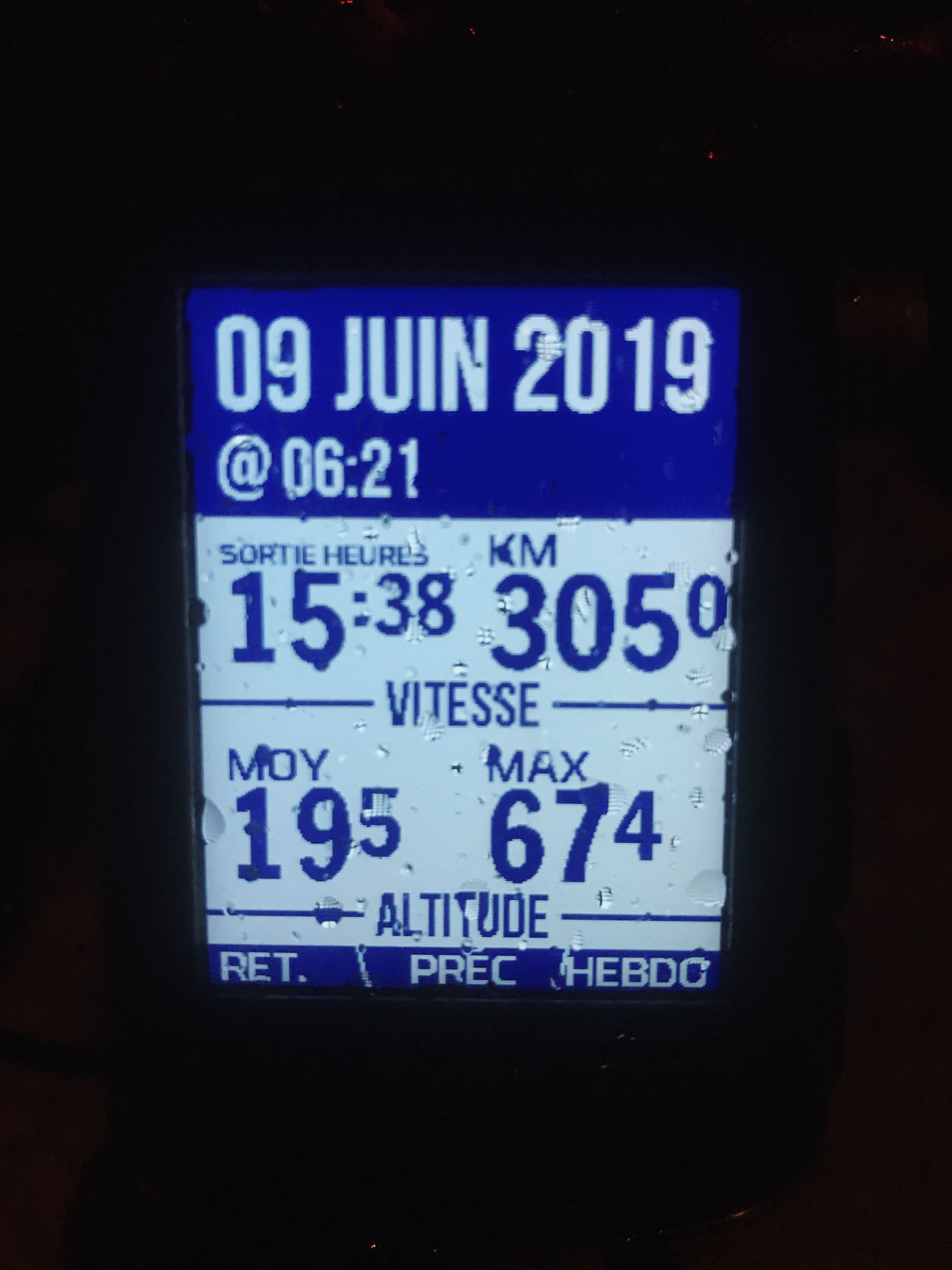 4 heures de sommeil. Ça pique un peu mais si on veut finir dans les temps de course, il faut rouler. Dehors il pleut des trombes. Nous sommes ravis, vraiment.