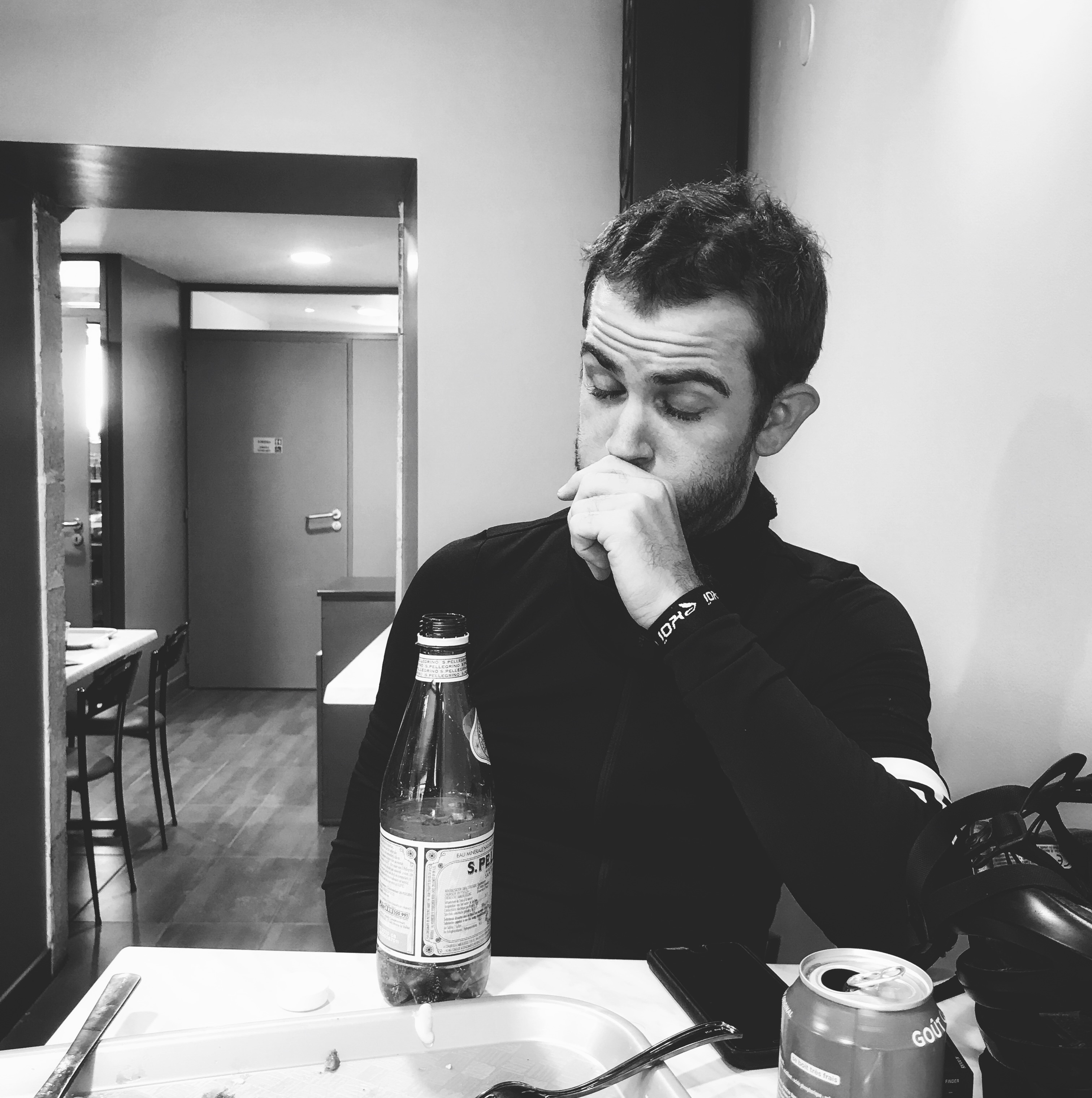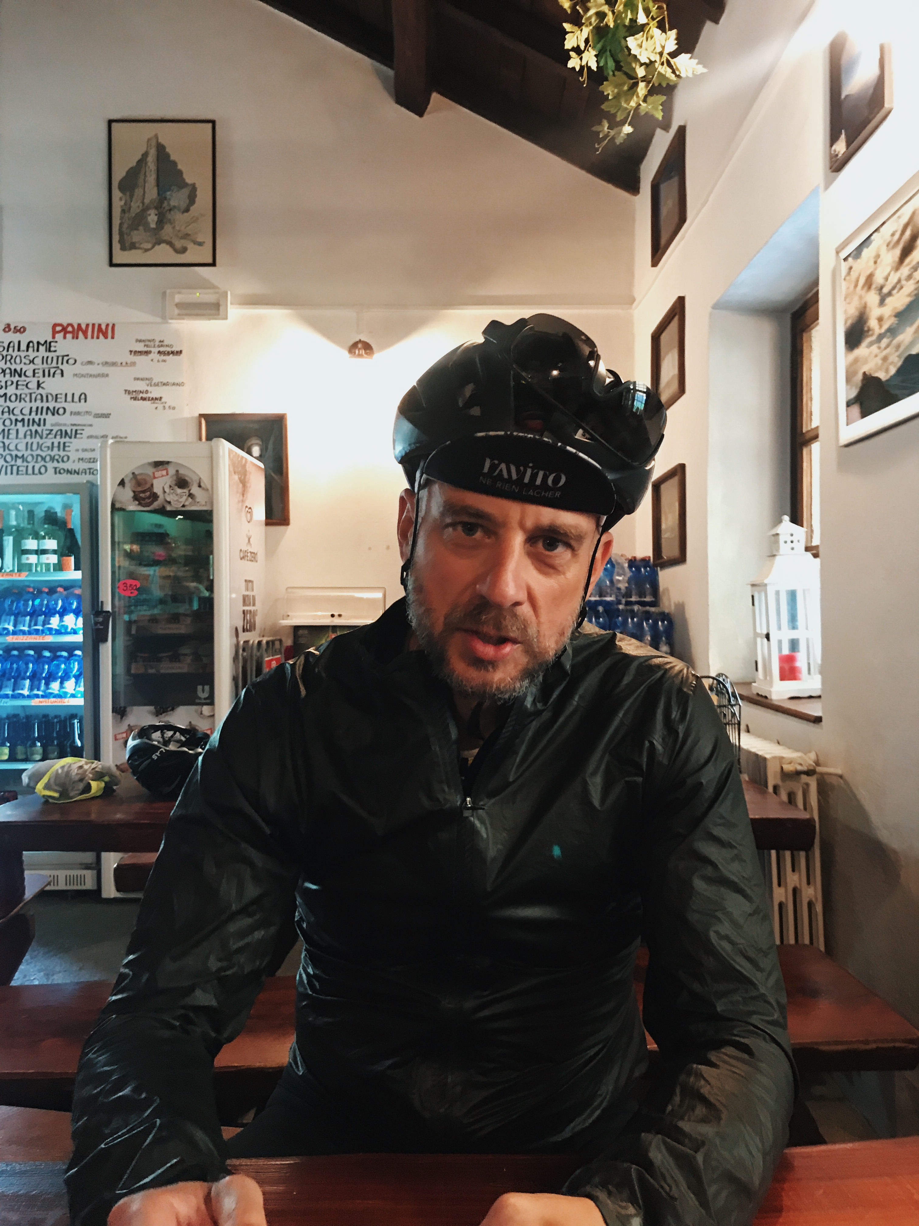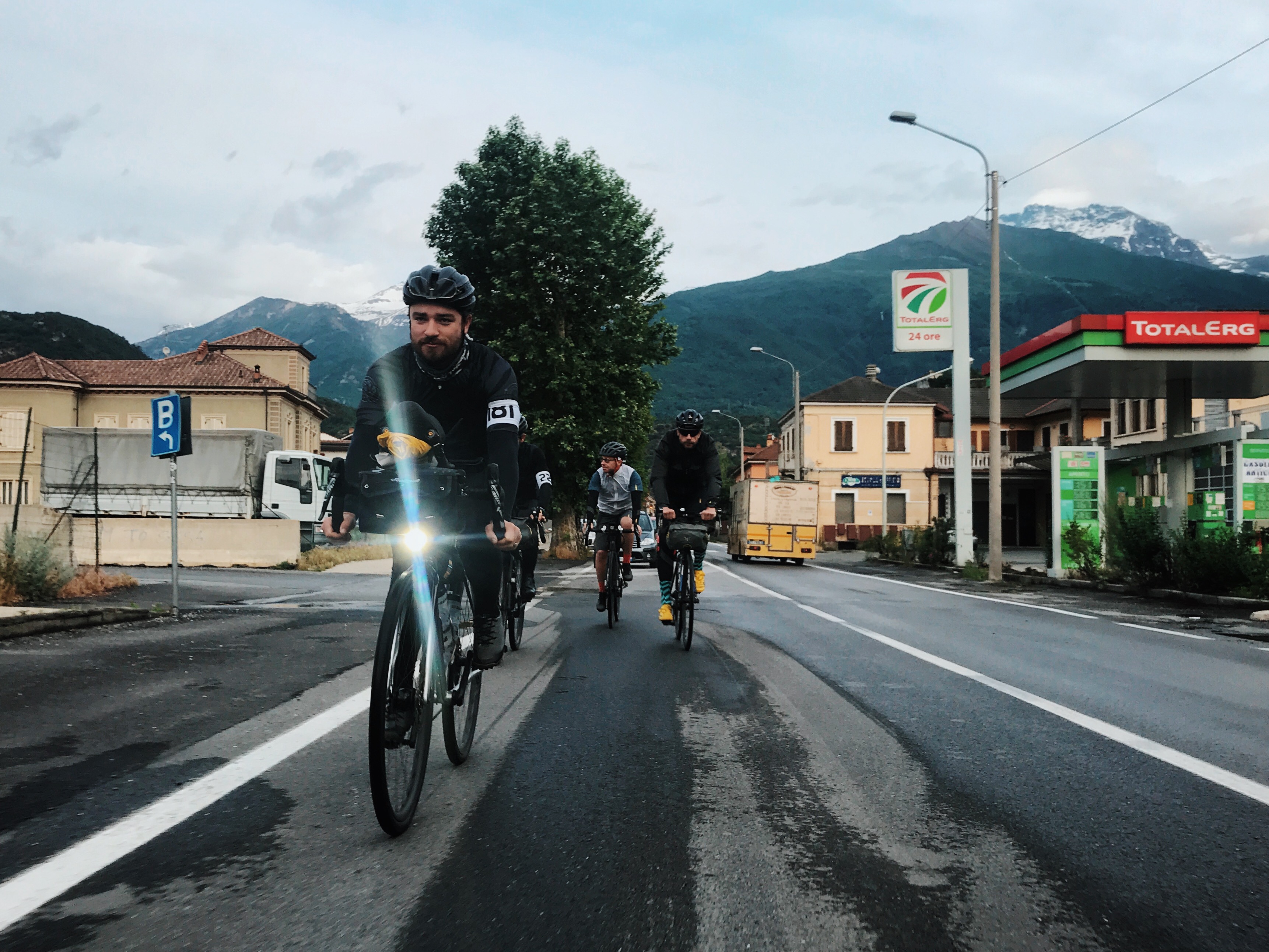 Susa, Italie. Première rue à droite, on trouve un hôtel 3 étoiles. Nickel. Énorme accolade tous les 3 alors qu’au même moment François Paoletti et Sylvain Renouf arrivent au bout de la rue dans notre direction. Ils comprennent bien ce qui vient de nous arriver. Eux aussi viennent de faire demi tour sur quelques kilomètres vu l’intensité de la météo. Il book le même hôtel. La soirée sera parfaite : douche salvatrice et grand combo pizzas bières en se racontant toutes nos mésaventures de la journée. On s’est rarement senti aussi vivant !