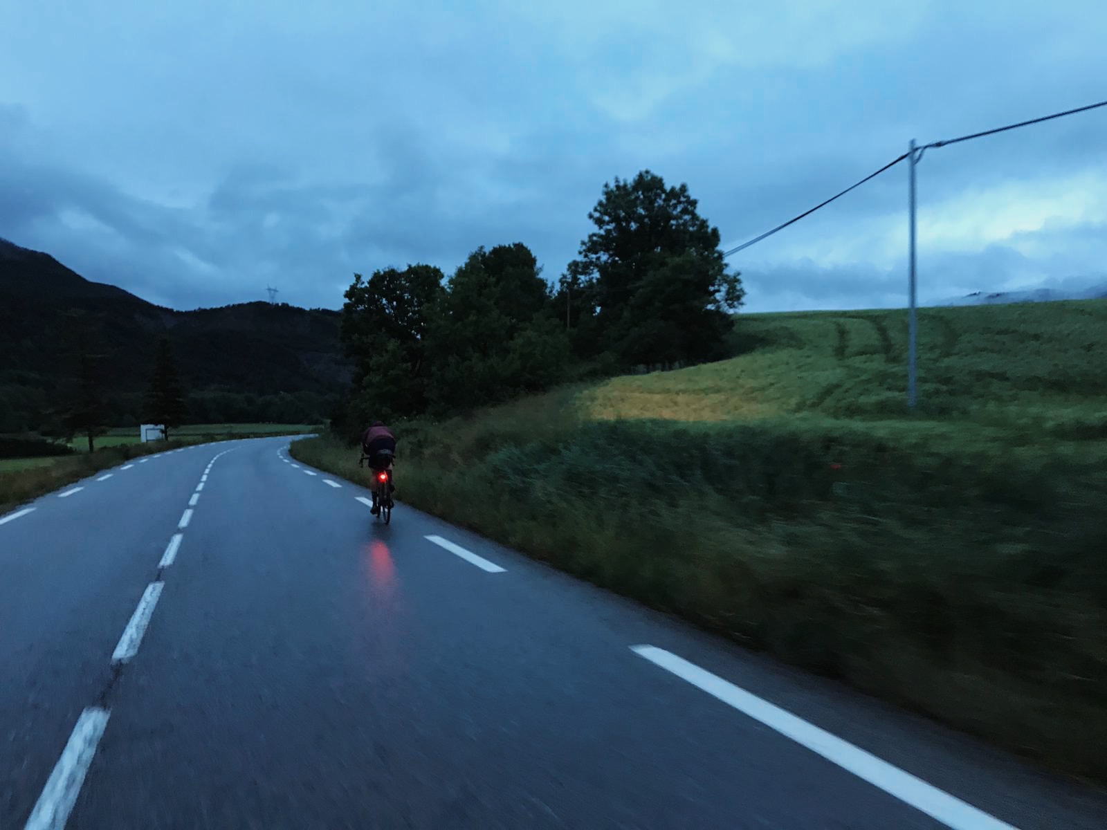 On peut vous dire que ce fut intense et un peu planant : un bon vent de face non stop, des gels Gu quand les yeux veulent se fermer mais aussi le calme d’une fraîche nuit de juin. Les kilomètres déroulent et nous voilà enfin en train de remonter des concurrents endormis à droite et à gauche de la route. Au petit matin on est à nouveau dans l’aventure.