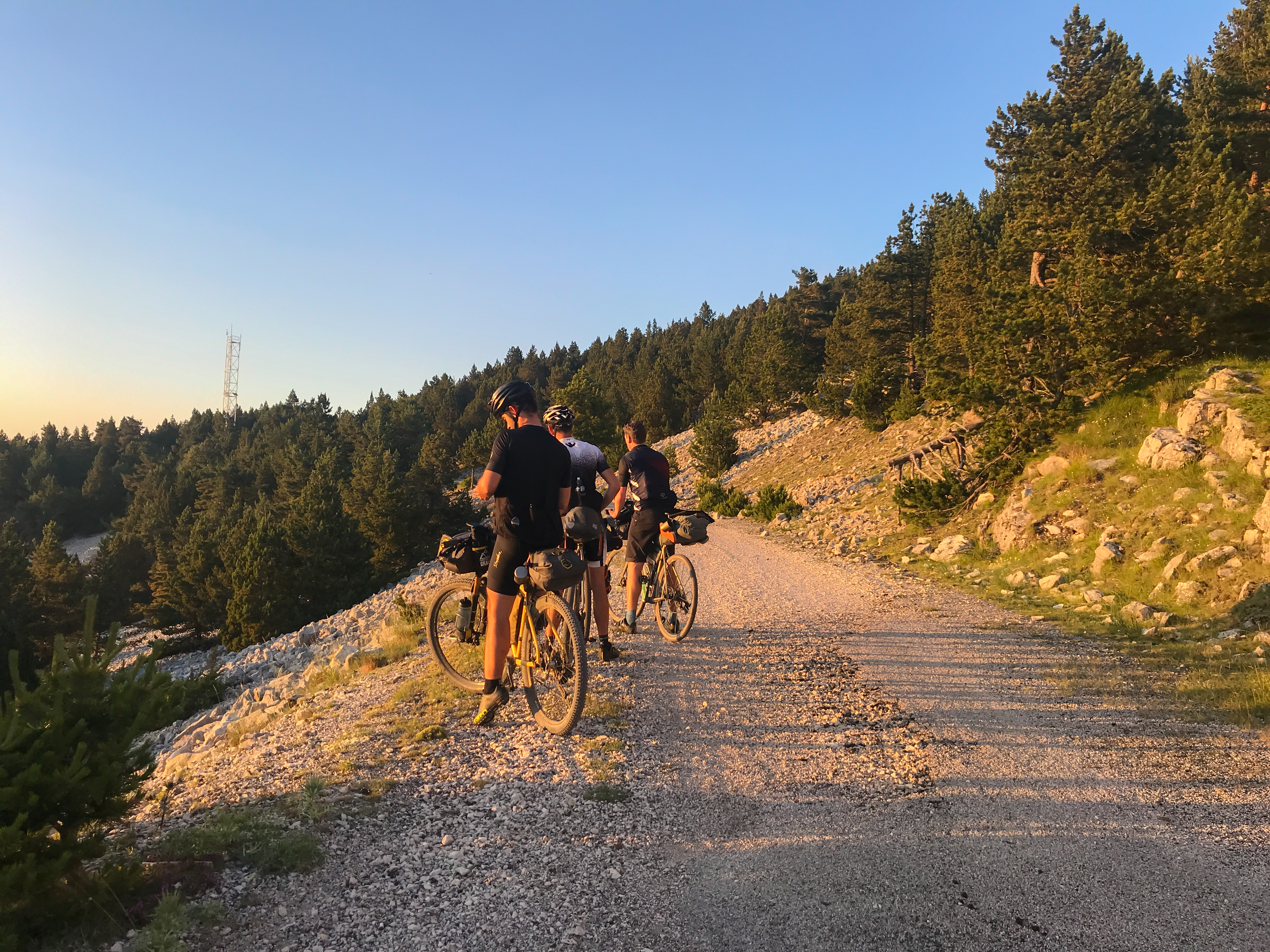 Il est 15h, il fait 40°C à l’ombre et on recharge de sealant le pneu arrière de sims. A 17h on est à Bédoin, on se charge de fromage, charcuterie, oeufs pour le festin du soir. La complexité du bikepacking en mode Tetris intrigue les estivants. 2, 3L d’eau par personne pour l’ascension, le repas, la nuit et le matin. Chantier. Au passage, énorme merci à l’employée du restaurant qui nous a gentiment laissé une bouteille d’eau sous une palette au sommet. Big Up.