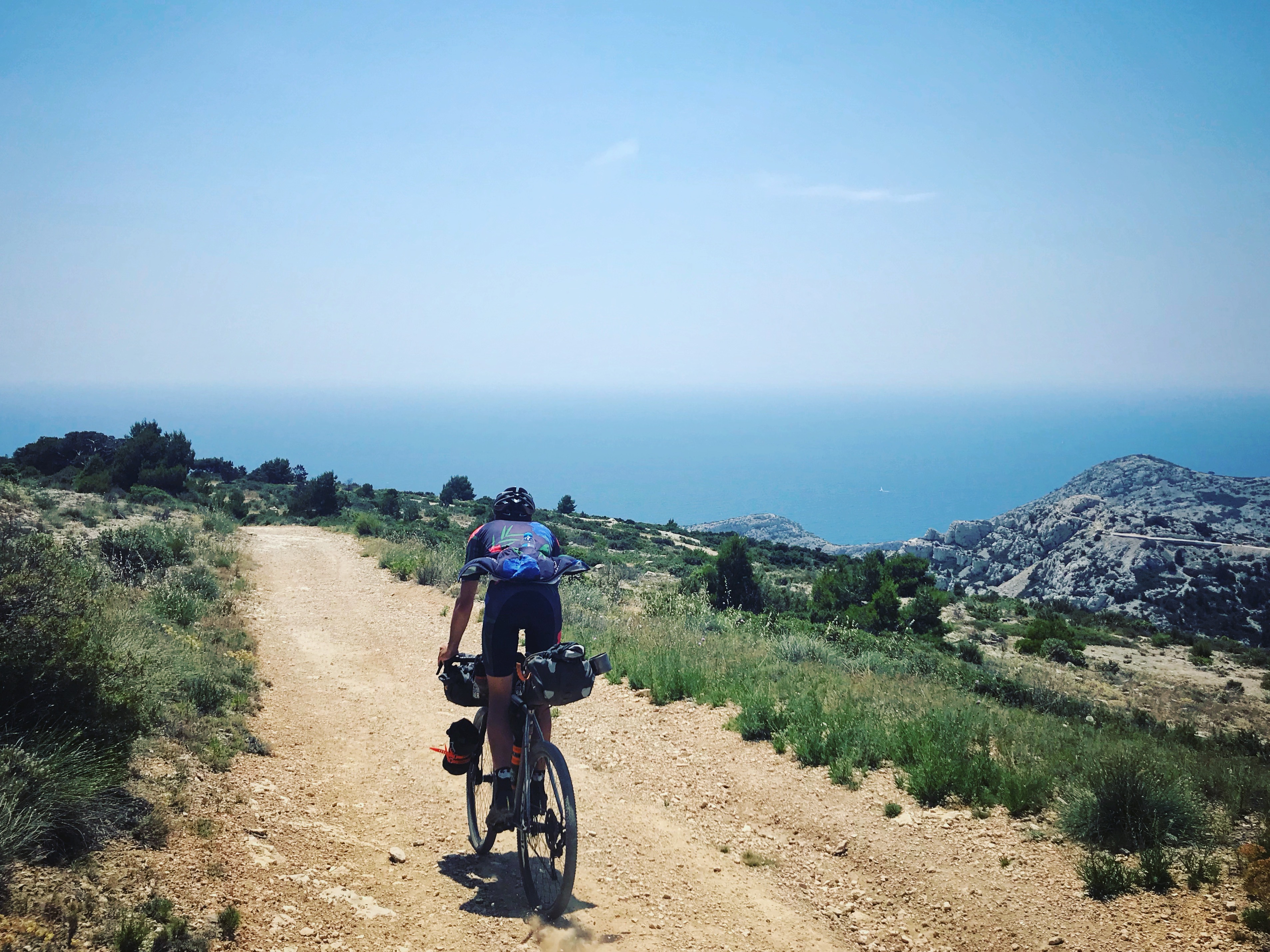 Demain au programme, l’Espigoulier, Cassis, les calanques, la grande bleue, plouf, Ricard. Le dernier matin d’aventure a toujours une saveur particulière, un sentiment particulier. Dernier pliage de tarp, on refait les sacoches une dernière fois et zouh en entame l’ascension du jour. L’Espigoulier par le gravier. Mythique, symbiose parfaite. En haut, la descente en bitume nous amène en périphérie de cassis, la claque est violente, le retour à la civilisation, à travers une bonne vieille ZAC des familles … c’est rude.