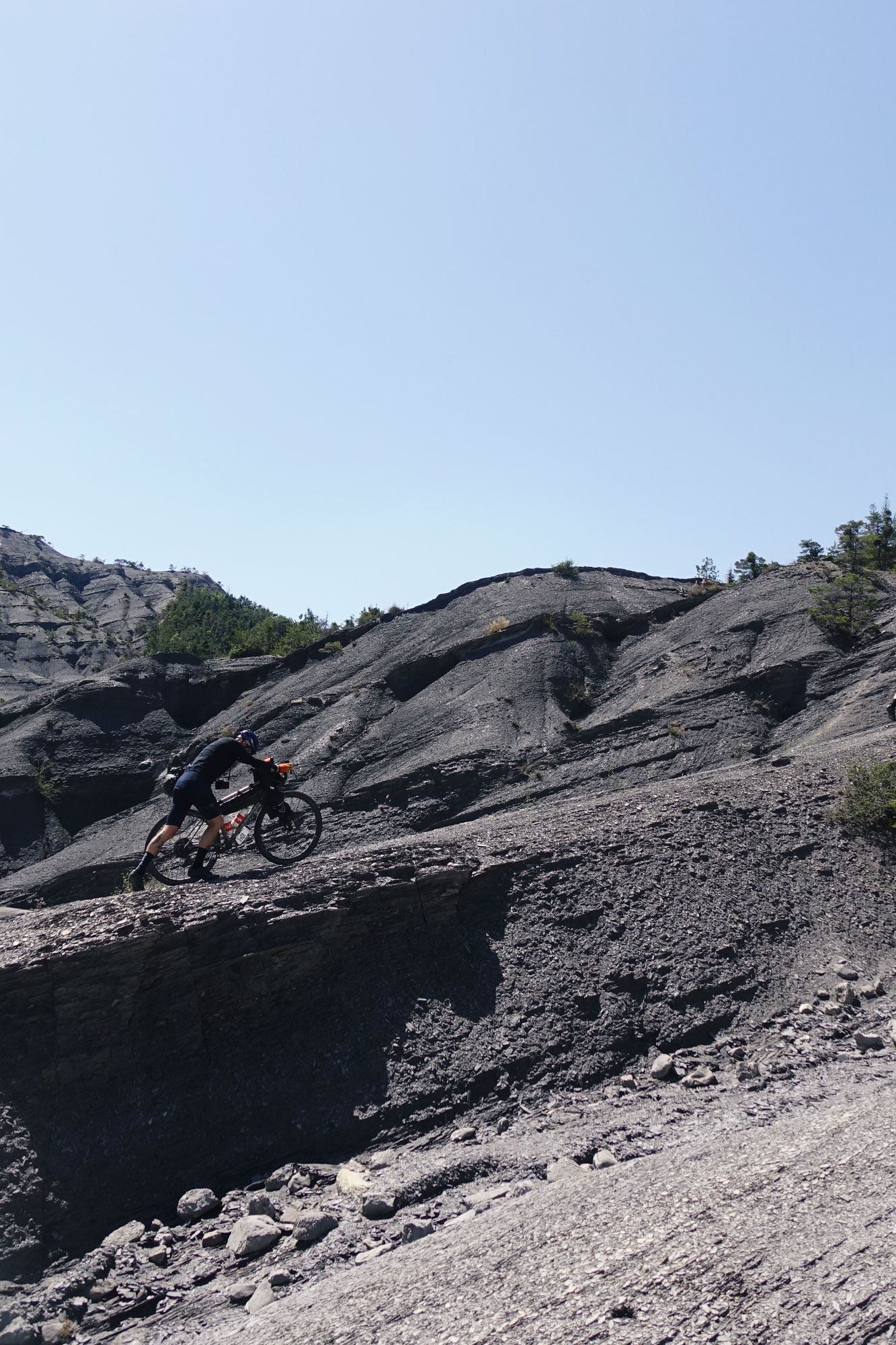 À chaque trip sa carte postale. Le truc que tu vois en plein hiver derrière ton écran au bureau, l’image, l’endroit qui te fait dire “OK, c’est ça, on va là les bros”. Les Terres Noires sont vraiment ce qui nous a intrigué et donné envie. Imaginez un désert bosselé d’ardoise où tout est gris. Pire que dans Fifty Shade of Grey, on arrive même pas à voir où il faut passer et mettre ses roues. Le fun est total. Surtout quand pour la première fois on voit le panneau piste (de VTT) noire.
