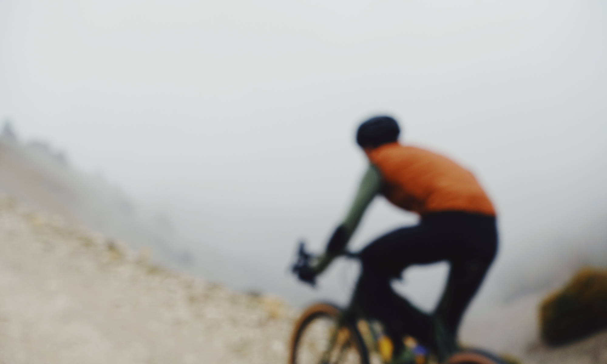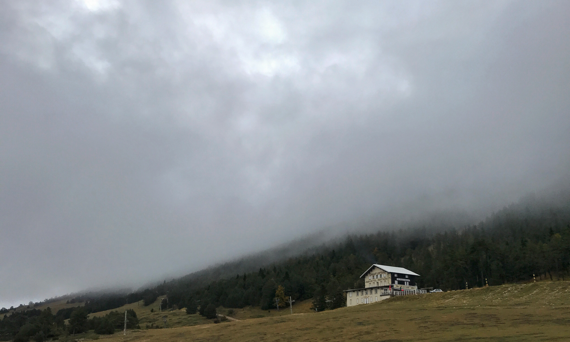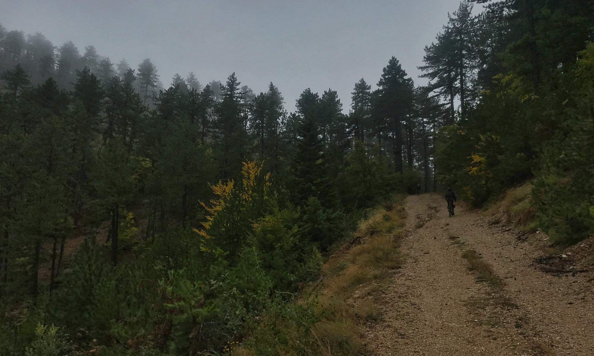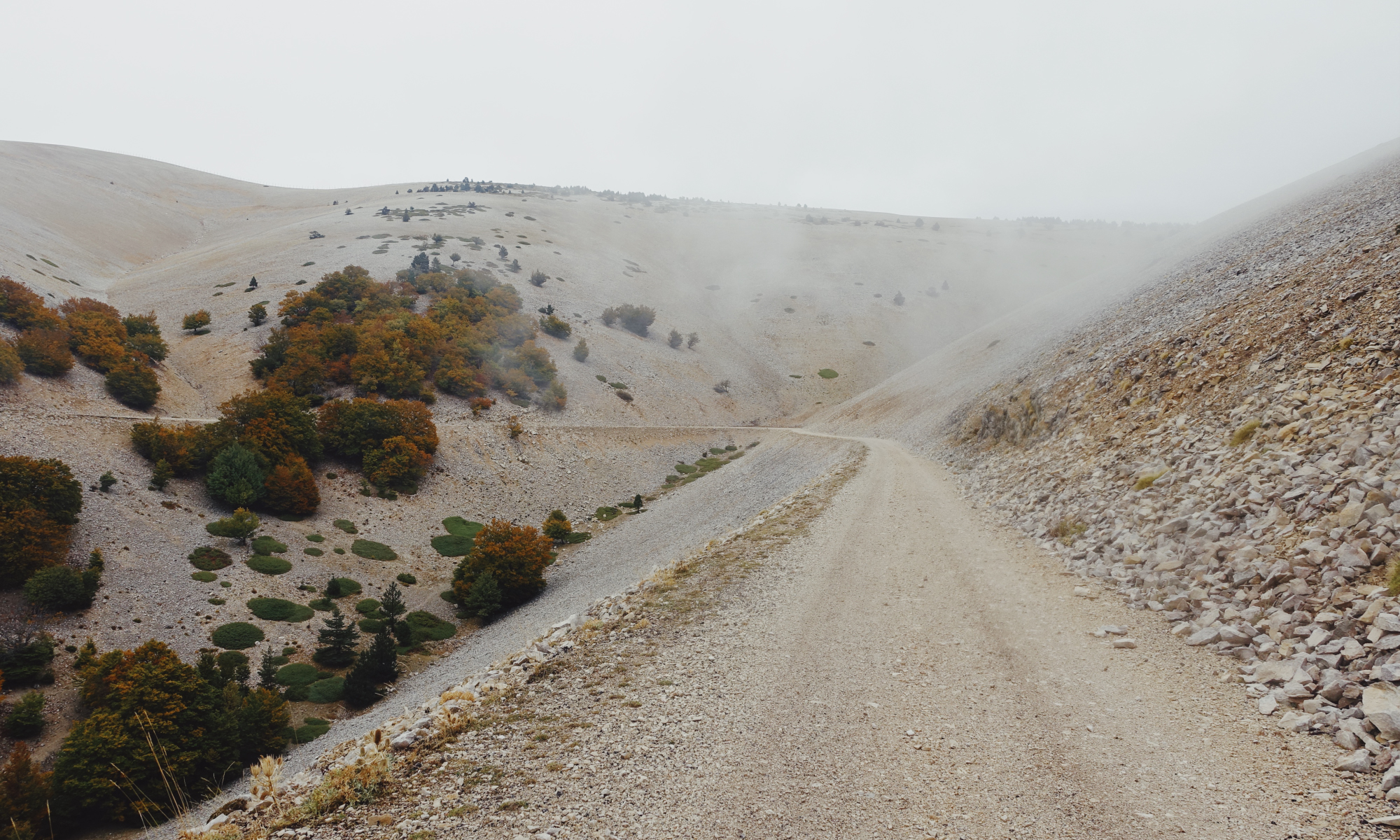 L’ascension commence après environ trois kilomètres de route, virage à droite et boom. On est accueilli par un gravier bien attendri par la pluie mais surtout du dénivelé positif… genre beaucoup ! Cette face du Ventoux se grimpe à la régulière. Les moins patients en paieront le prix dans quelques kilomètres quand les pourcentages vont avoisiner les 15%… De temps en temps nous apercevons le sommet entre la brume et les montagnes. C’est pas idiot à regarder mais on commence à sentir que la vue panoramique qui doit nous attendre au sommet ne sera peut être pas au rendez-vous. Bien vu l’aveugle, on voit à peine à 30 mètres !
