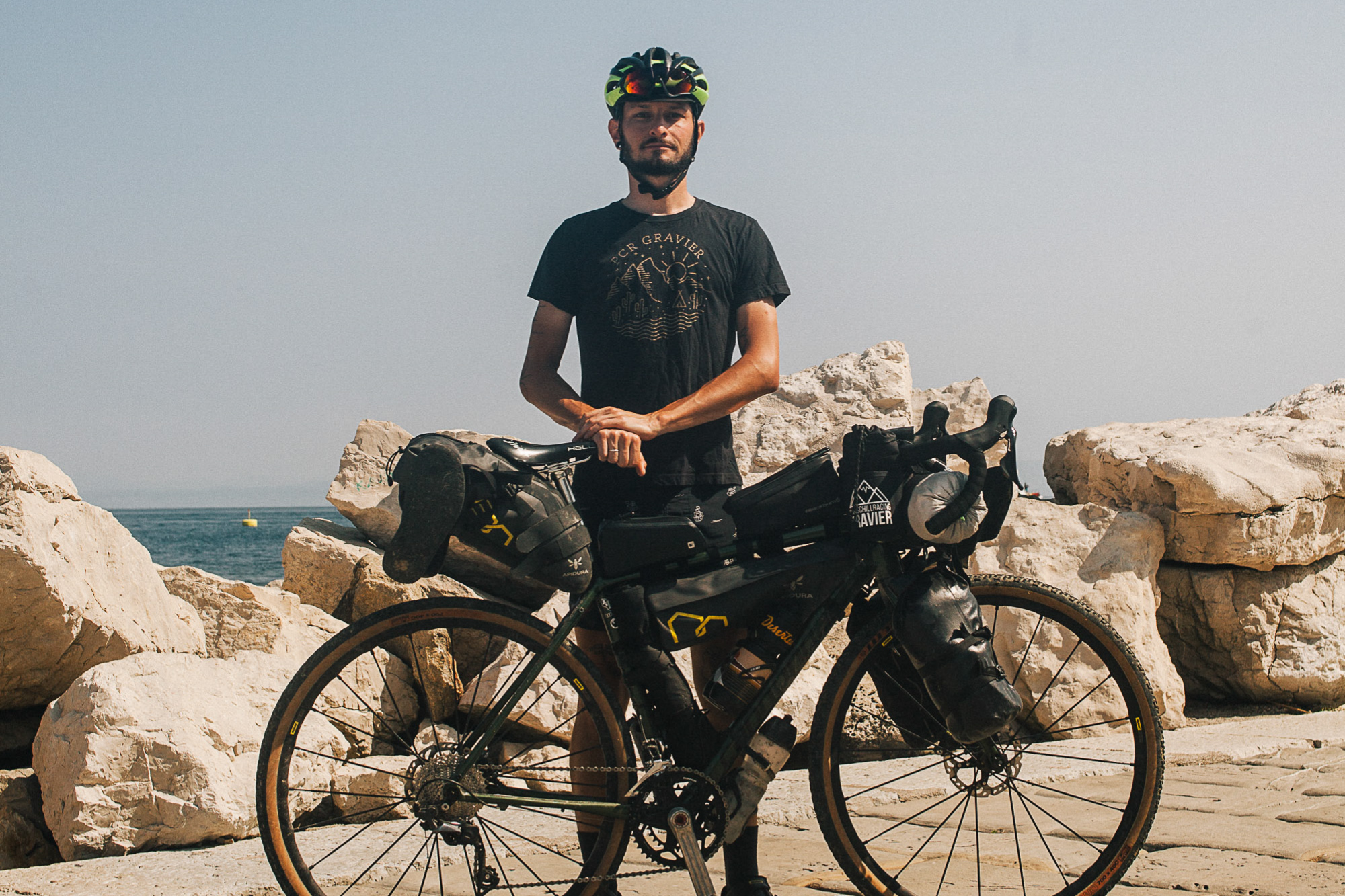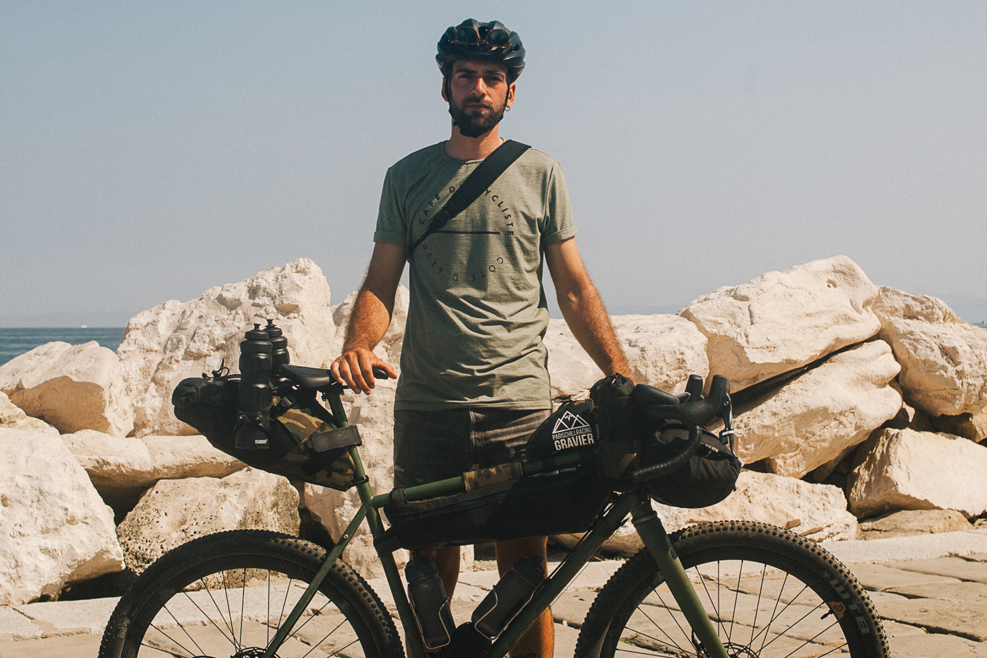 Pour le reste, c’est vous qui voyez (si possible en titane, mais c’est juste notre avis), on est ouvert à tout. On met juste un véto sur les cadres de VTT avec des cintres route et aux gravels avec prolongateurs. Au final, on n’a pas deux vélos identiques dans le groupe. C’est un peu la foire à la saucisse (en titane) entre les groupes, les largeurs de pneus, les sacoches…